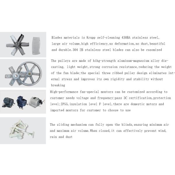 The shutters of greenhouse poultry centrifugal industrial wall exhaust fans ventilating and cooling system industrial exhaust fan come with swung drop hammer, which can be tightly closed to keep out light, rain or dust, through-wall mount type, clean and tidy or wide open for ventilation purposes in winter.